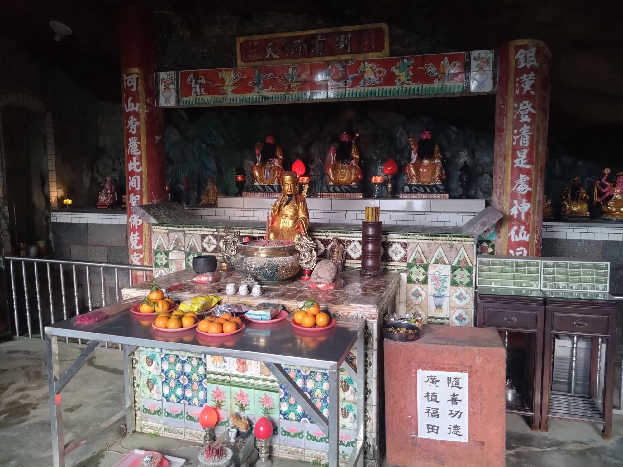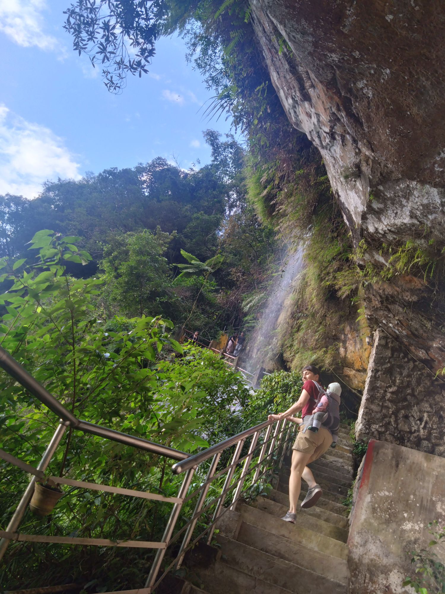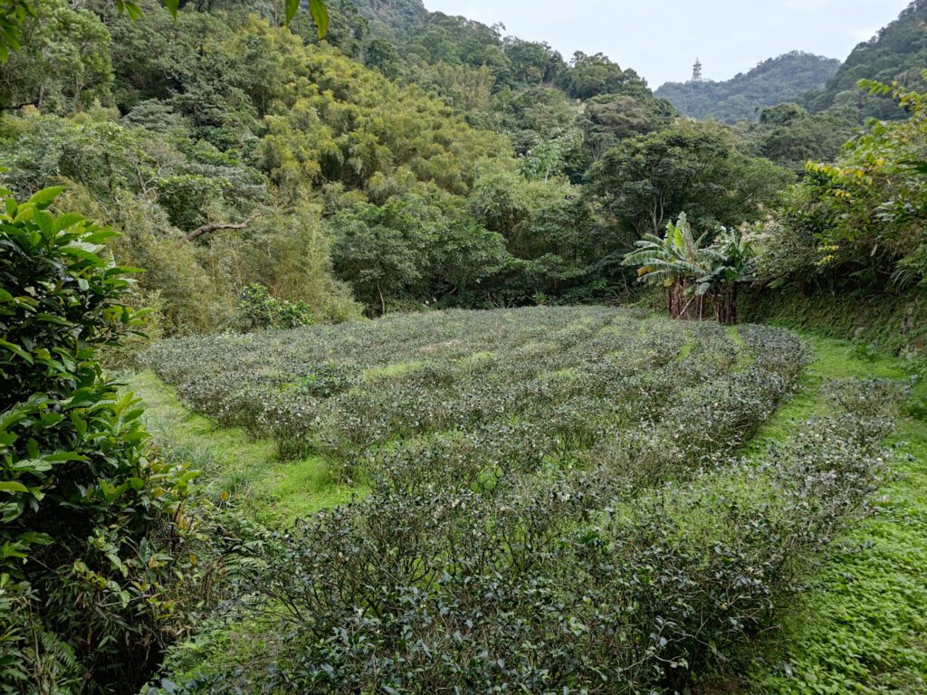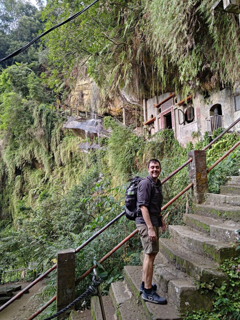 Mit einem Softeis „gestärkt“ sind wir dann zum Teefeld gegangen. Dort habe ich gelernt, dass zwischen den Teepflanzen früher Lupinen gepflanzt wurden, da diese den Stickstoff im Boden halten. Und weil wir noch nicht genug Bewegung am Tag hatten, die Beine sich noch gut angefühlt haben und genug Zeit bis zum Sonnenuntergang war, sind wir spontan zum Yinhe-Tempel gewandert; …oder haben die Stufen genommen. Der Tempel wurde in den Fels am Wasserfall gearbeitet und hat mehrere Höhlen. Auf dem Weg dahin ging es durch einen schönen Wald mit ziemlich vielen Stufen. Sowohl hoch als auch vor allem runter. Manche sind aus Steinen bzw Fels und manche aus Holzbalken, ähnlich wie alte Bahnschwellen. Dementsprechend kurz ist teilweise die Auftrittsfläche. Der Weg dorthin hat sich für uns allerdings definitiv gelohnt, auch wenn wir keine lange Pause am Tempel machen konnten, da abzusehen war, dass unser Kleiner auf dem Rückweg wieder wach wird und dann eine kleine Pause braucht. Diese machten wir bei einem kleinen Shinto-Schrein, der dem oder einem Erdgott gewidmet war. Wir sind uns sicher, dass er nichts dagegen hatte. Mit einer weiteren Pause vor der Rückfahrt zum Strampeln auf dem Dach der Metrostation ging unser Plan auf, sodass wir ohne lange Wartezeit und im Sonnenuntergang die Bahn zurück nach unten nehmen konnten.
