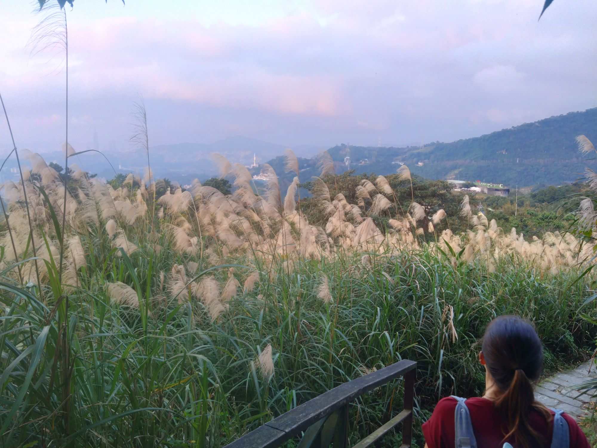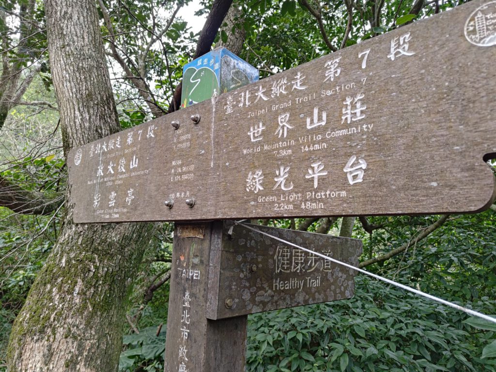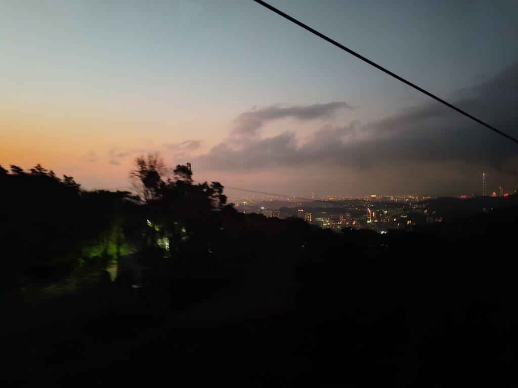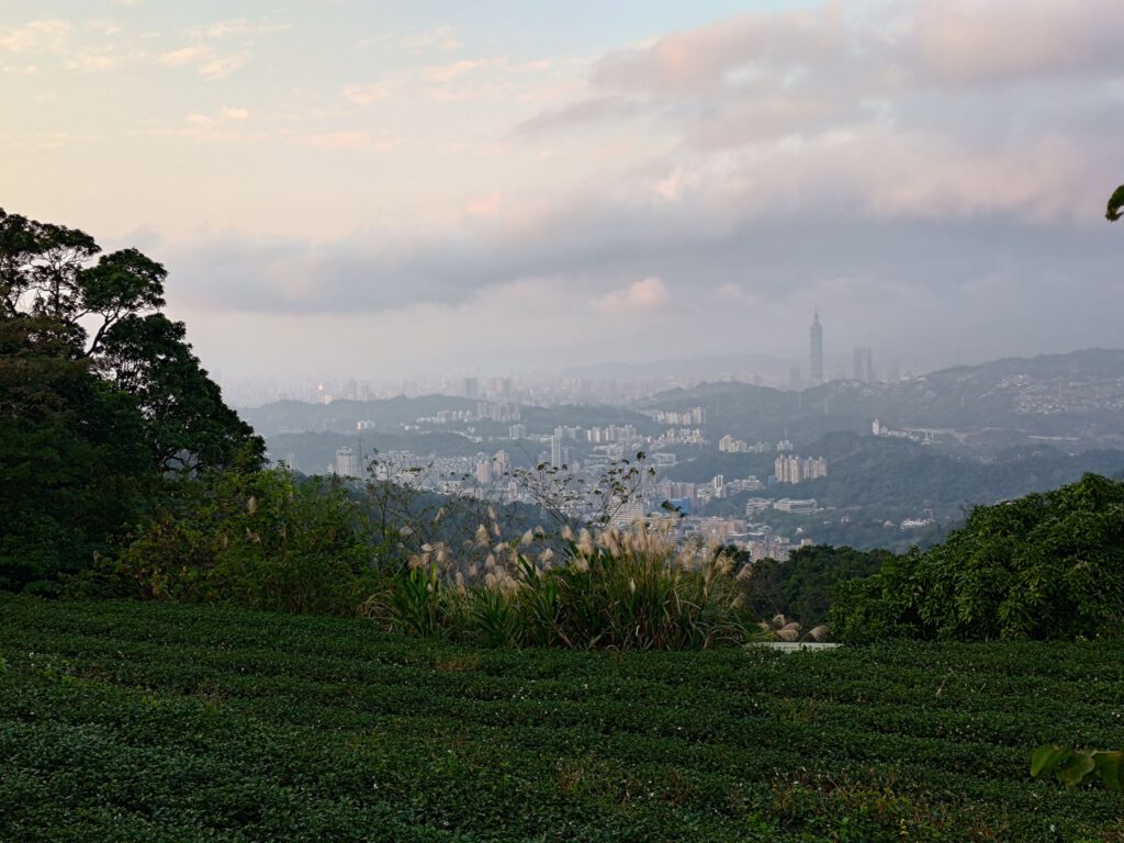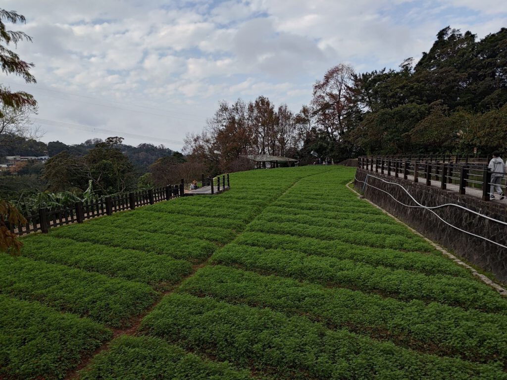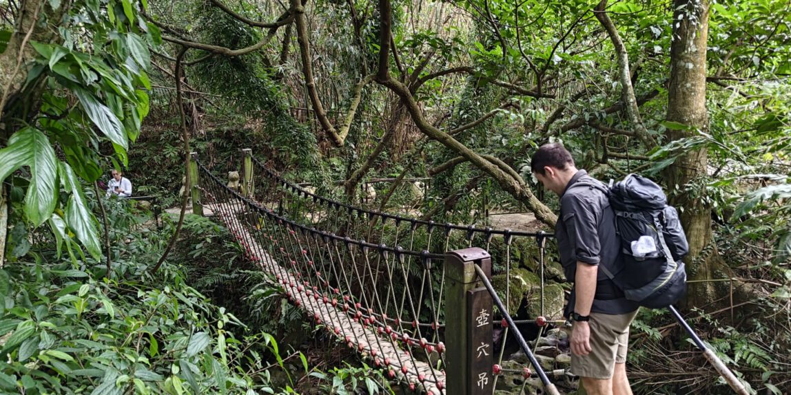 Das mit dem zu Fuß gehen haben wir tatsächlich ernst gemeint und sind deshalb mit der Metro bis an die Endhaltestelle Taipei Zoo gefahren, von wo aus die Gondel ins Maokong-Teeanbaugebiet fährt, um dort eine kleine Wanderung zu machen. Weil wir erst mittags an der Gondel waren, suchten wir uns oben angekommen eine relativ kurze Route mit ca 4,5 km aus, den Healthy Trail. Die Fahrt nach oben war mit 30 min lang genug, um den bekannten Reisehunger zu bekommen und deshalb gab es mal wieder einen Snack. Micha kaufte einen frittierten Pfannkuchen mit Ei. Mit diesem in der Hand liefen wir zum Einstieg in den Trail, da in Taiwan das im Gehen Essen nicht verboten ist. Die Straße führte uns zu einer Ansammlung von Teehäusern, von denen die ganze Straße nach Grüntee roch. Unser Trail war vor allem eins: und zwar stufig (das Wort etablieren ich hiermit). Zunächst durften wir mit einer Menge Stufen durch den Wald runterlaufen, um nach ca 300 m in der Ebene die Höhenmeter mit Stufen wieder zurückzulaufen. Nunja, danach wusste ich zumindest wofür ich ins Fitnessstudio gehe, weil Max auch auf dem Rücken viel Kraft erfordert. Der Weg war sehr schön angelegt und brachte uns zu einer großen kaum besuchten Aussichtsplattform, wo wir unsere Mittagspausen machten. Die Mückenstiche im feuchten Wald habe ich für die ganze Familie eingesammelt, es waren zum Glück nicht allzu viele. Als wir am frühen Nachmittag an der Gondelstation ankamen, war die Warteschlange für die Abfahrt so lang, dass wir entschieden, ein nahes Teefeld anzuschauen. (Man muss wissen, dass die Gondelbahn über 4 km lang ist und knapp 300 Höhenmeter über mehrere Berge überbrückt. Mal eben zurücklaufen wäre viel zu weit, sodass alle die hochfahren auch wieder runterfahren.)