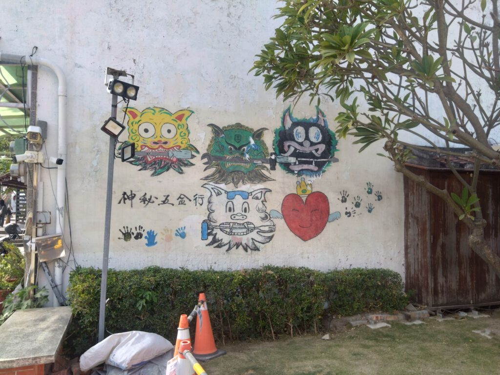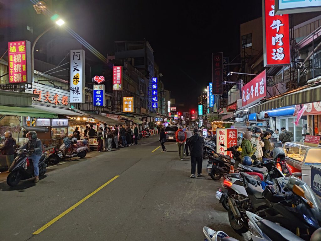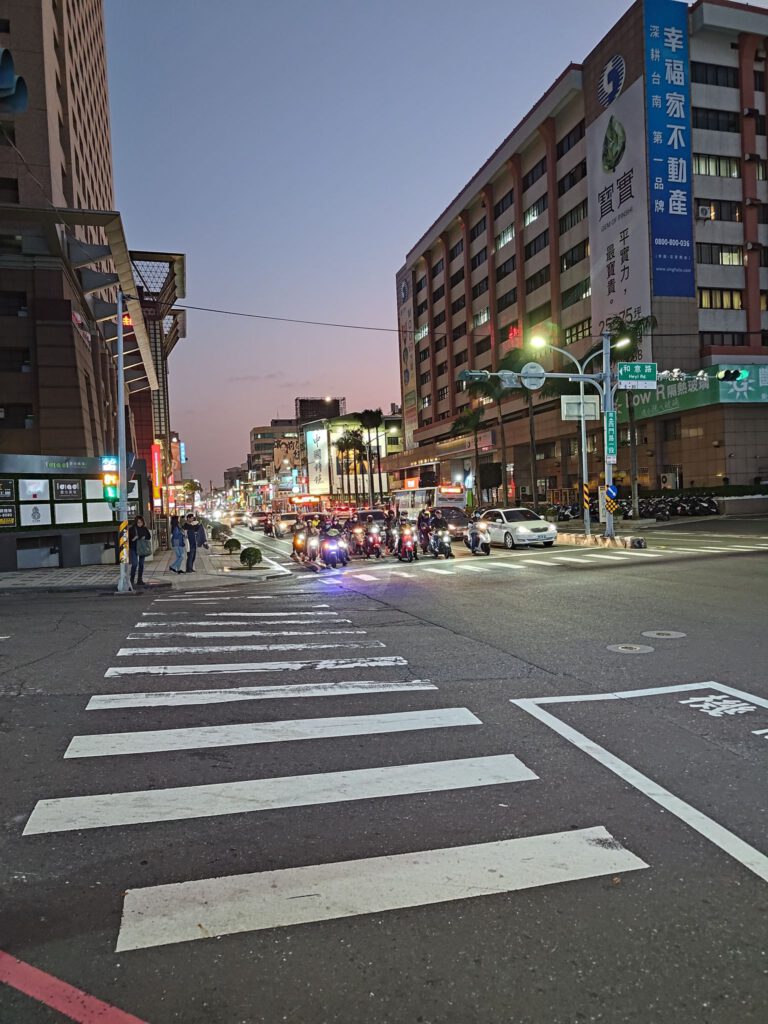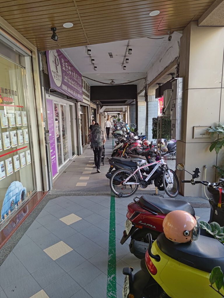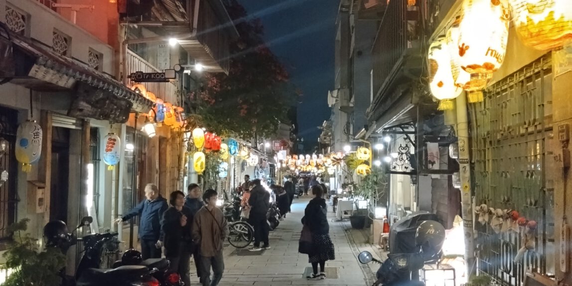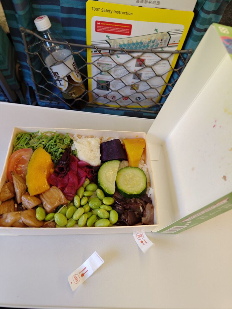 Für die knapp 2 stündige Fahrt haben wir uns am Hauptbahnhof eine Bentobox gekauft, was hier viele Leute machen. Die ist günstig (ca 3 €) und macht satt. Es gab eine große Auswahl und das bestellen ging zum Glück leicht, indem ich auf die Schildchen auf der Scheibe gezeigt habe, weil ich immer noch kein Mandarin kann. Die Boxen waren in großen Stapeln vorbereitet, weshalb ich denke, dass zu Stoßzeiten richtig viel los ist. Danach gingen wir in den Wartebereich, wovon es in Taipeh einen unter und einen über dem Gleis gab. In die Wartebereiche kann man 60 min vor Abfahrt des Zuges und sind notwendig, da die Bahnsteige sehr eng sind. Wenn man dann aufs Gleis geht, gibt es für jeden Wagen und den Sitzplatznummerbereich eine zugewiesene Tür, wo man sich dann in einem eingezeichneten Bereich in einer Schlange aufstellt. Das ist sehr organisiert aber funktioniert auch. Auf der Fahrt stellten wir fest, dass die Landschaft uns stark an Japan erinnert. Wobei wir hier nicht von weiter Natur sprechen, sondern von Feldern zwischen Häusern am Stadtrand, da die Westküste sehr dicht bevölkert ist. An größeren Feldern sahen wir einige Gewächshäuser als wir schon nahe an Tainan waren. Hier ist es nämlich deutlich wärmer als in Taipeh. Aus Sicht der Tainaner muss Taipeh Sibirien sein, weil unser Gastgeber im Hotel uns fragte, ob es in Taipeh nicht ziemlich kalt wäre. Für uns war es eine Fahrt vom Frühling in den Sommer, wir konnten uns also nicht beschweren. Das Hotel liegt in einer der vielen verwinkelten kleinen Gassen, die es in Tainan zwischen den Hauptstraßen gibt und war sehr schön. Da hat Micha was richtig schönes kleines gefunden! Wir sind übrigens mehr als einmal am Hoteleingang vorbeigelaufen, weil der etwas versteckt ist. Nach dem Check-in haben wir einen Spaziergang gemacht, weil wir unter anderem Anti-Mückenspray gebraucht haben. Das spazieren machte allerdings nicht so viel Spaß, weil es an den Hauptstraßen ziemlich laut ist und es oft keine Gehwege gibt. Die vorhanden Arkaden gehören zu den Häusern und sind fast alle auf einem anderen Niveau. Sprich, dass man ständig eine Stufe hoch oder runter muss – mal mit Rampe, mal ohne, mal eine kleine Stufe und mal eine große. Und vor allem abends werden die Flächen für Mini-Restaurants und Imbisse für die Küche genutzt. Als Spaziergänger muss man dann auf die Straße ausweichen. Ich empfand das nicht als gefährlich sondern vor allem als ungemütlich. Auf der Suche nach einem Abendessen schauten wir uns die Stände an und landeten schließlich zufällig bei einem kleinen japanischen Lokal.