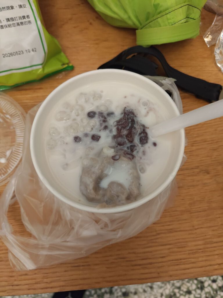 Süße Sojamilch mit Reis, Seidentofu, roten Bohnen und Marzipancreme. Voll mein Geschmack, auch wenn es farblich kein Hingucker ist!
