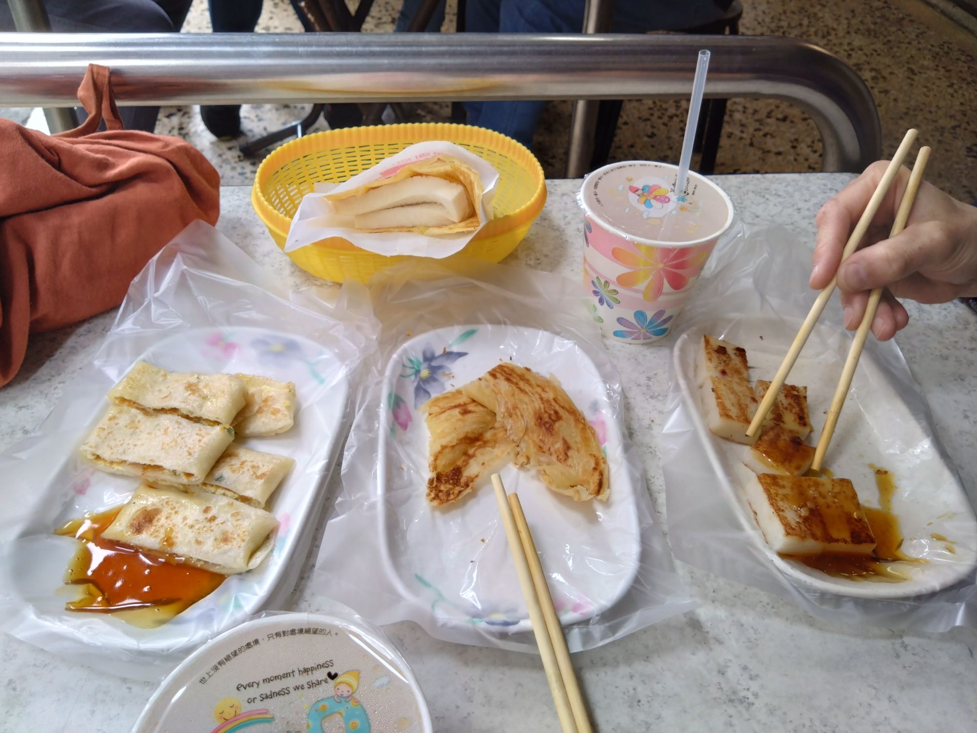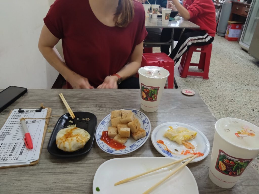 Für den letzten Tag hatte ich mir den Besuch des Nationalen Palastmuseums gewünscht, das die meisten alten chinesischen Kunstschätze besitzt. Da es im Hotel kein Frühstück gab, suchten wir uns ein Frühstückslokal um die Ecke aus. Und zum ersten Mal hatten wir eingepacktes Geschirr. Ich hatte das schon ein paar Mal gesehen, dass kleine Lokale, die von Hand spülen, manchmal die Teller und Platten in passende Beutel packen und somit den Aufwand für sich gering halten. Etwas komisch aber passt zur allgemeinen Menge an Wegwerfprodukten, die mir aufgefallen sind. Auf jeden Fall war es lecker und nach etwas Stress mit der Bussuche, waren wir auf dem Weg ins Museum. Auf dem Weg dorthin hatten wir wie beim Taipei 101 schon unser ganzes Gepäck dabei, weil wir danach direkt in unsere letzte Unterkunft wollten. Voll beladen standen wir im Stadtteil Shilin und haben nach dem richtigen Bus und der dazugehörigen Haltestelle gesucht, da wegen des Sonntags die Busse von der Google-Auskunft abwichen. Praktischerweise sprach uns eine Frau auf deutsch an und bot uns ihre Hilfe an. Sie selbst war Taiwanesin doch durch ihren deutschen Mann konnte sie auch deutsch und auf jeden Fall englisch. Das war wirklich nett. So gab sie uns den Tipp eine andere Linie zu nehmen, die am Museum bis oben hin fährt und nicht am Fuß der Treppe hält, damit wir nicht so viel hochschleppen müssen. Der Tipp war super, zumal die meisten Leute (vor allem Museumbesucher) erst eine Haltestelle später einstiegen, sodass wir einen Sitzplatz im sehr voll gewordenen Bus bekommen haben.