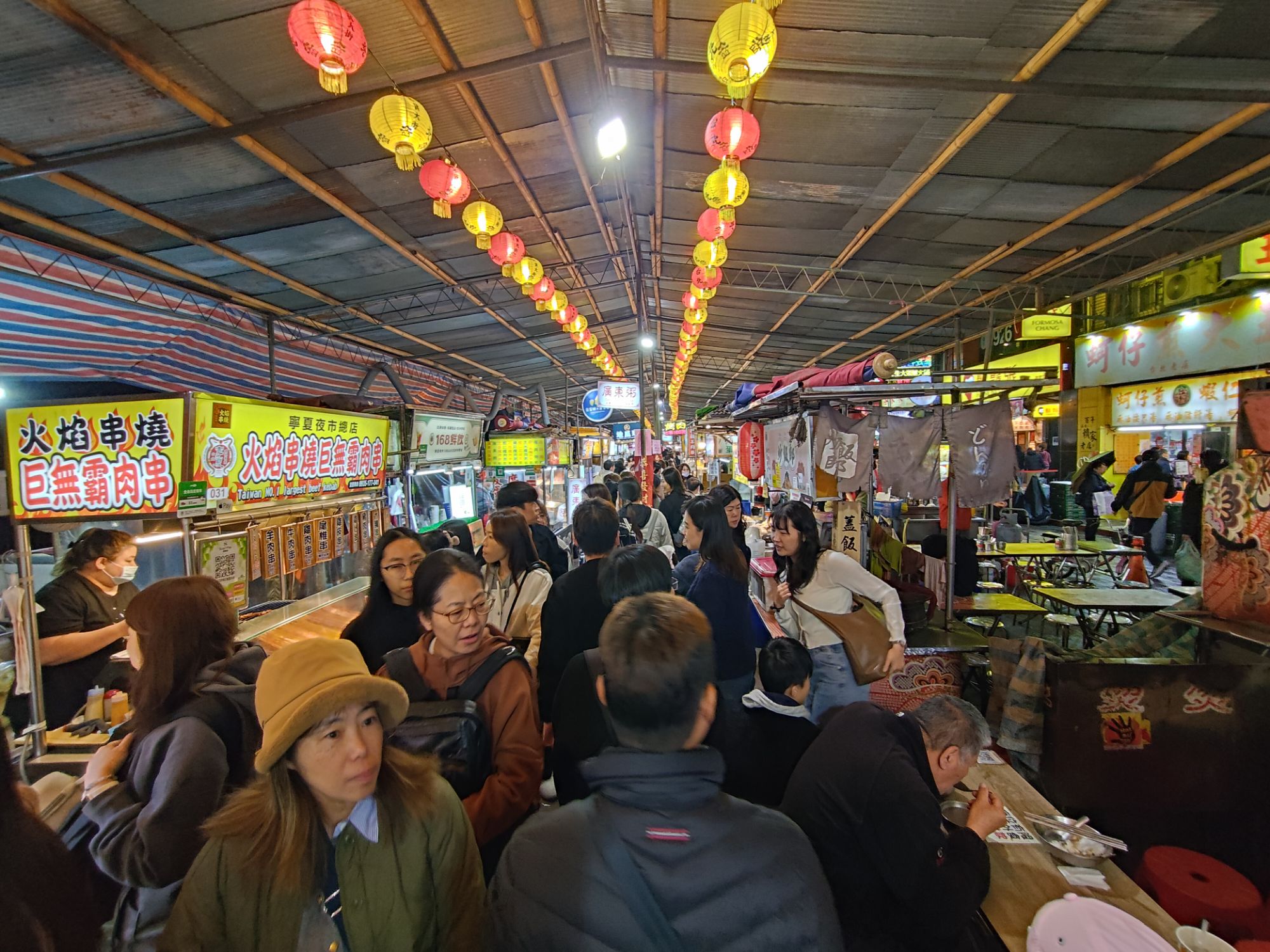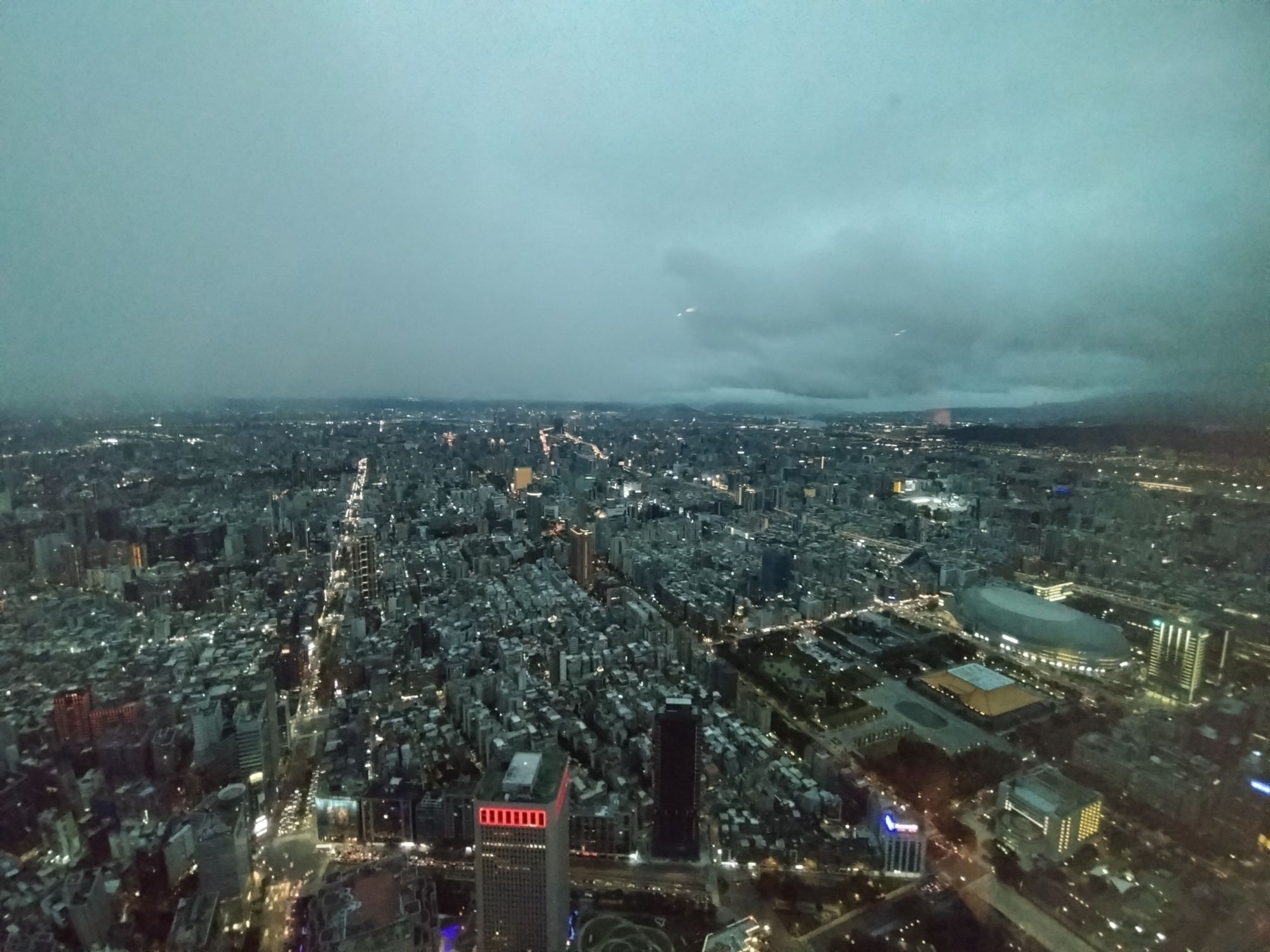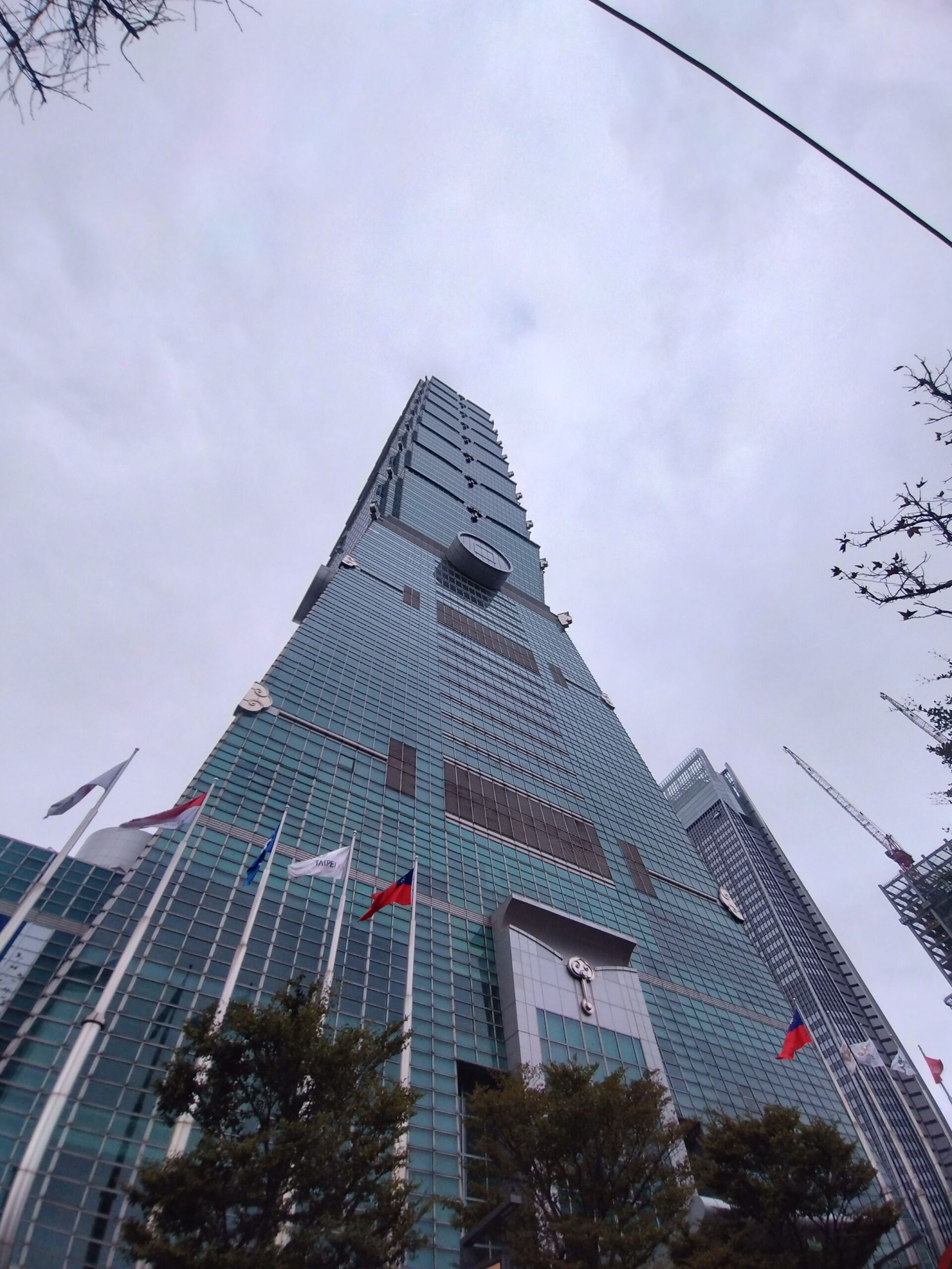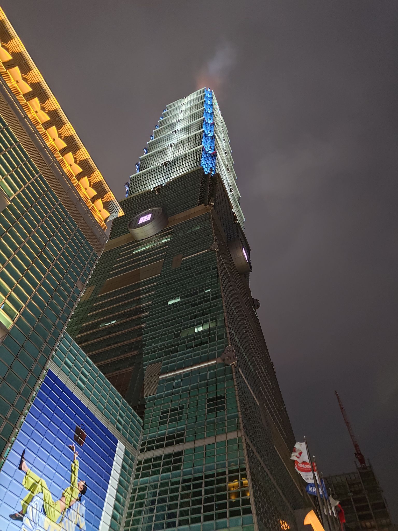 Am Taipei 101 gingen wir erstmal zu den Schließfächern unten im Einkaufszentrum, damit wir überhaupt auf die Aussichtsplattform gehen konnten. Wir hatten damit gerechnet, länger warten zu müssen, um hochfahren zu können aber konnten direkt durch gehen. Der Aufzug ist einer der schnellsten der Welt und beschleunigt so stark, dass es sich ein bisschen wie bei einem Flugstart anfühlt. Nach nur 40 s waren wir im 89. Stock auf 400 m Höhe. Wir hatten den Besuch auf dem Turm zu Beginn des Urlaubs wegen des riesigen Wetters an das Urlaubsende geschoben und hatten tatsächlich Glück. Es war zwar grau aber wir konnten die Stadt unter uns gut sehen. Mit weniger Wolken hätten wir sogar noch einen schönen Sonnenuntergang sehen können. Trotzdem waren wir ziemlich lange oben und gingen erst in der Dämmerung einen Stock runter, wo man die Ausgleichsmassee, den Dämpfer, für Schwingungen des Gebäudes wie bei Erdbeben sehen konnte. Eine riesige gold lackierte Stahlkugel, die 660 Tonnen schwer ist. Dank Buggy durften wir mit dem Fahrstuhl den einen Stock runter fahren während alle anderen die Treppe nehmen müssen. Dafür haben sich die Mitarbeiter am Aufzug per Funk verständigt, damit wir das eine Stockwerk fahren können, weil das nicht auf dem Bedienpult ist. Wir also rein in den Aufzug und nach ca 30 s drückte Micha auf den „Türen öffnen“- Knopf, weil wir nicht so losfuhren. Die Mitarbeiterin war ganz schön erstaunt, dass wir immernoch da waren, weil eigentlich jemand von unten den Aufzug rufen sollte. Sie öffnete schnell ein verstecktes Bedienpanel und so kamen wir doch noch im richtigen Stock an. Wir wurden super freundlich empfangen. Bitte hier entlang, Warteschlange nach unten machen Sie bitte mal Platz, Achtung eine Stufe, hier nochmal entlang und dann hatten wir es geschafft. Am Dämpfer zeigten Videos dessen Bewegungen während den letzten großen Erdbeben in Taiwan. Das war schon beeindruckend zu sehen. Die Aufzugsfahrt runter dauerte übrigens etwas länger.