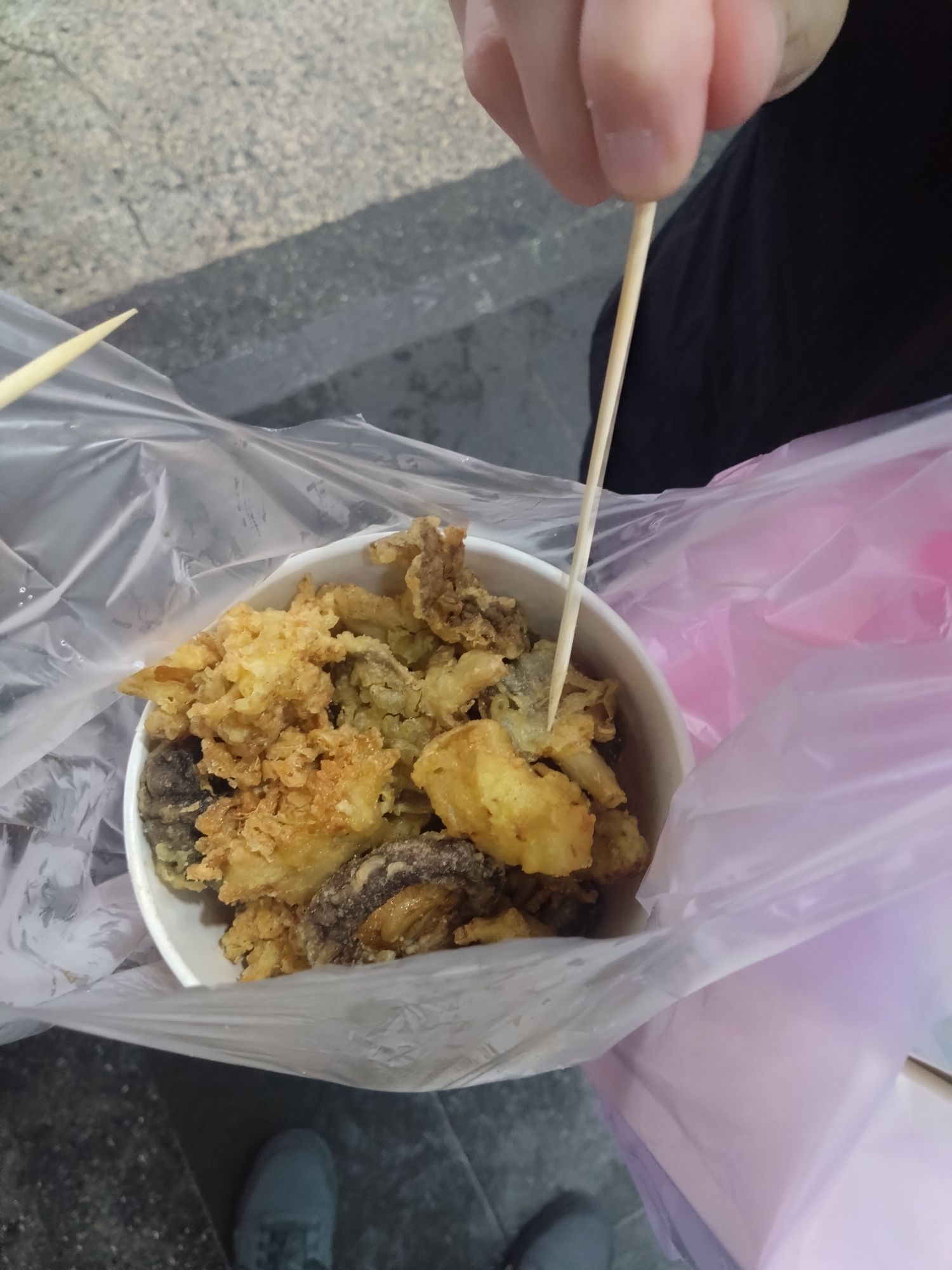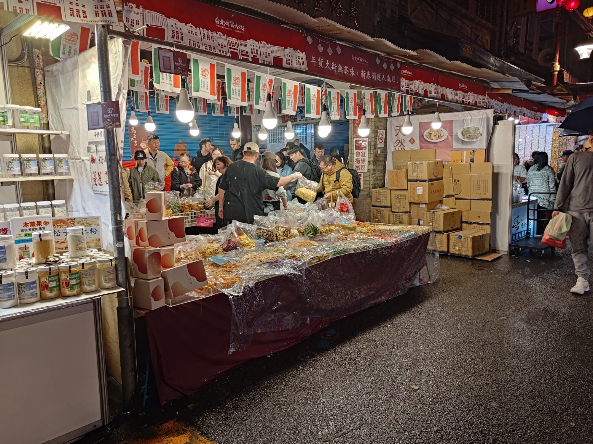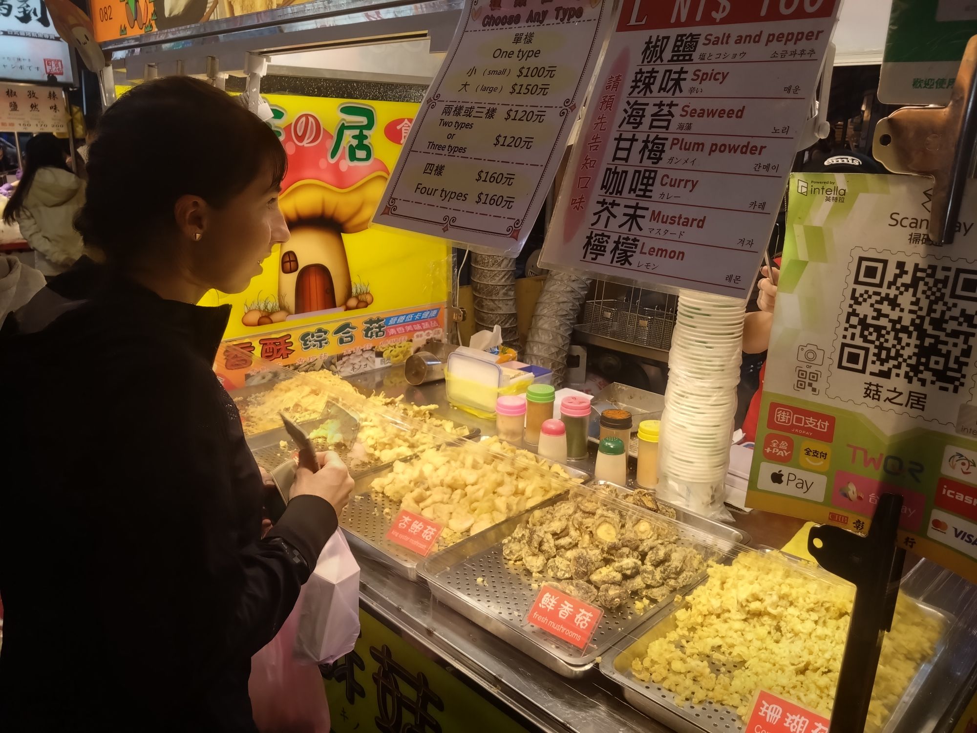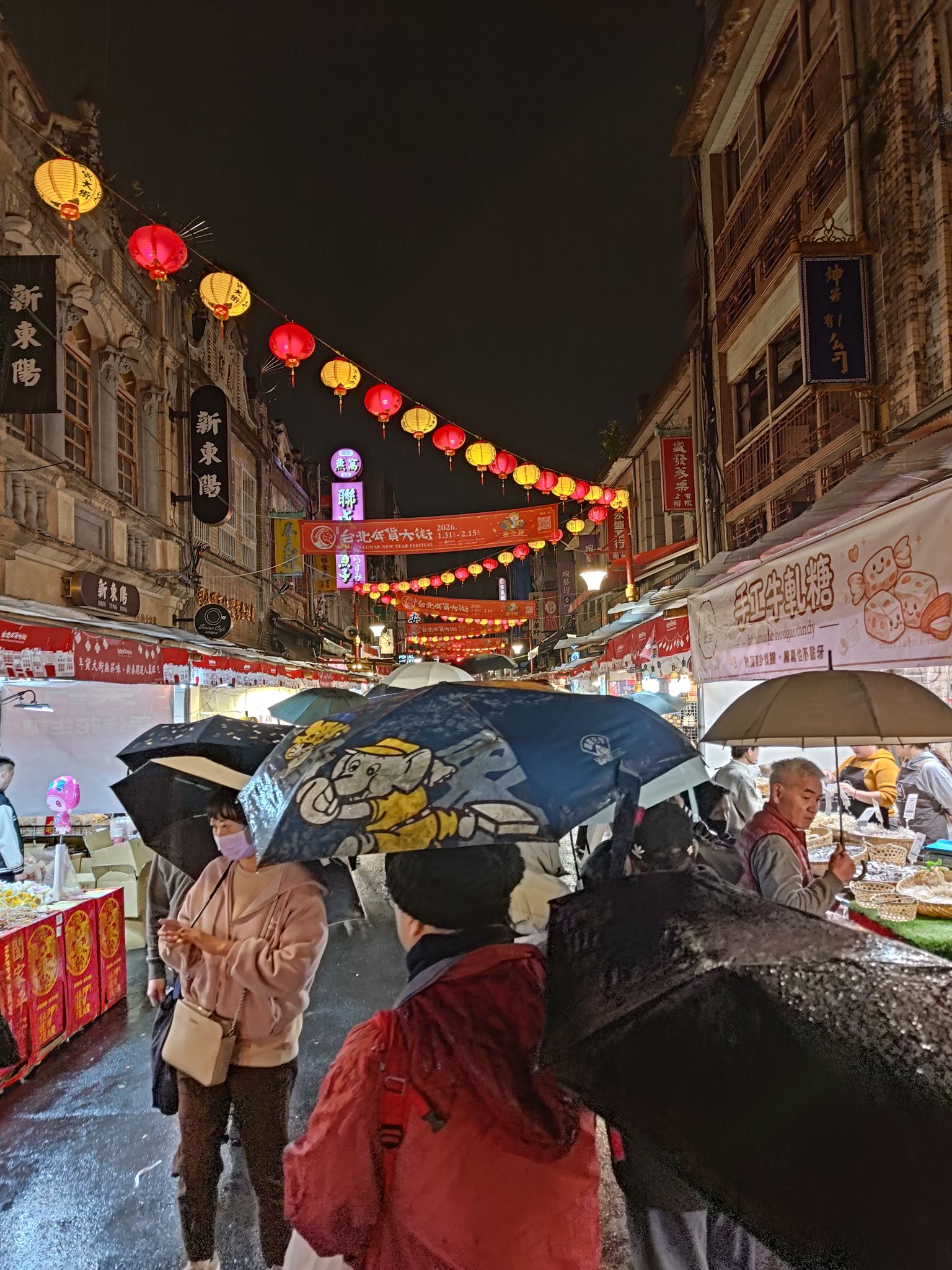 Vom Hotel machten wir einen Spaziergang zur nahegelegenen alten Straße, in der es viele alte Häuser im westlichen Stil und einen Markt gibt. Von den Häusern konnte man leider nicht so viel sehen. Es regnete und das Meer an Regenschirmen verdeckte die Sicht und außerdem waren die Stände ziemlich gut beleuchtet. Es gab alles zu kaufen, von Süßigkeiten über Trockenfrüchte, später auch Kleidung und Kochzubehör. Viele Stände luden zum probieren ein und da wir noch nicht gegessen hatten, nutzte ich das auch ein wenig aus. Dort Gemüsechips, da was Süßes,… so konnte es doch weitergehen. Naja, vielleicht doch nicht, schließlich wird man davon auch nicht satt. Wir bummelten also weiter zum nächsten großen Nachtmarkt, um was richtiges holen. Praktischerweise war der überdacht, wenn auch richtig voll und wir somit mit durchs Gedränge mussten. Wir probierten einen frischen Guavensaft, Takoyaki mit Wasabi und einen großen Topf voller frittierter Pilze. Zum satt werden holten wir uns allerdings noch eine Portion kalte Nudeln mit Sesamsoße.