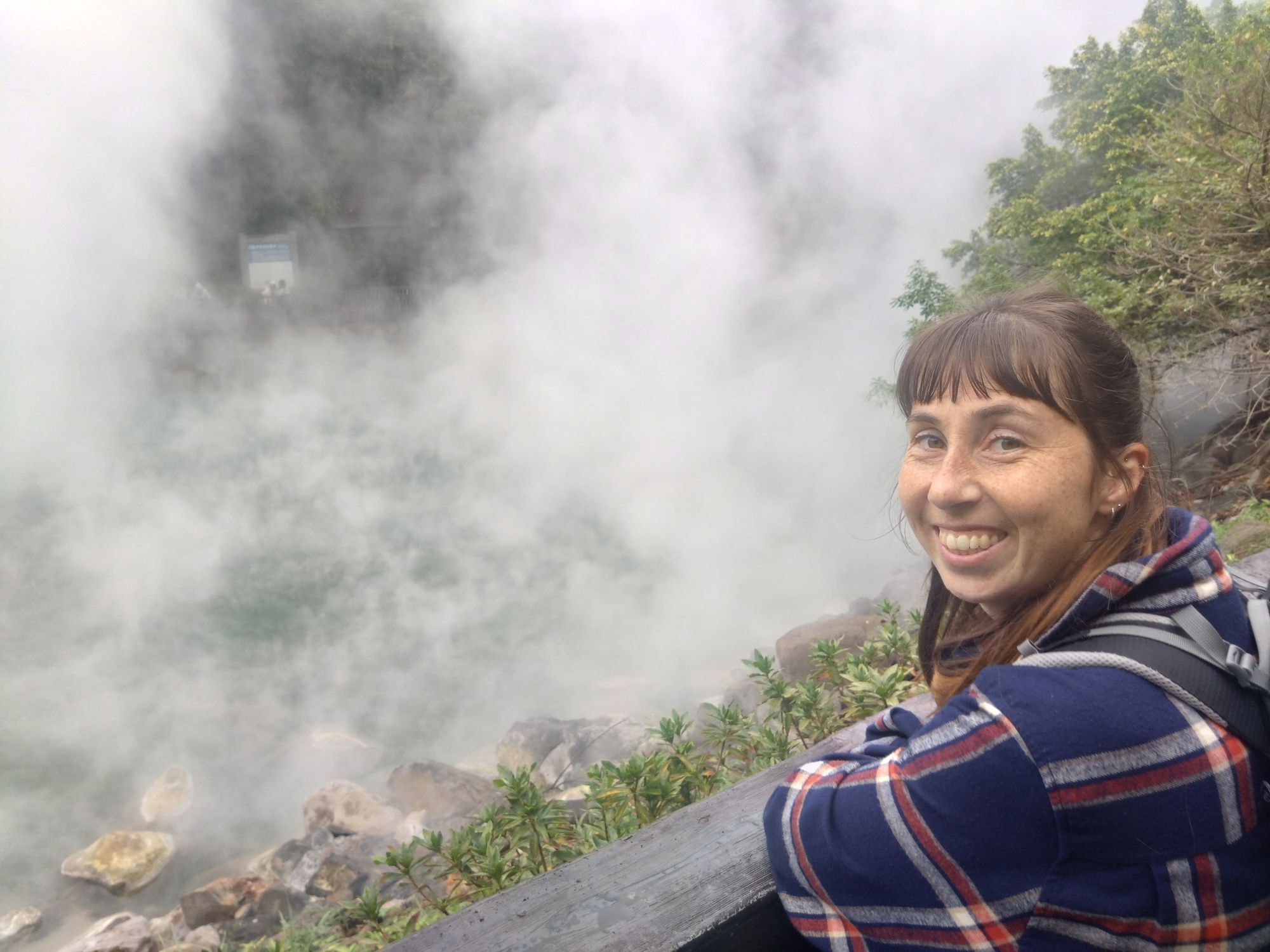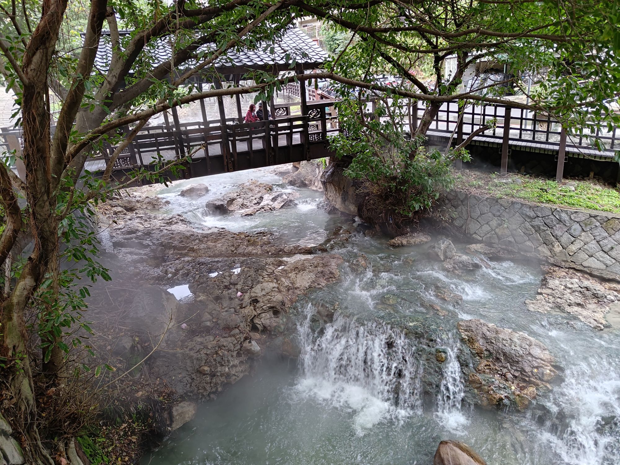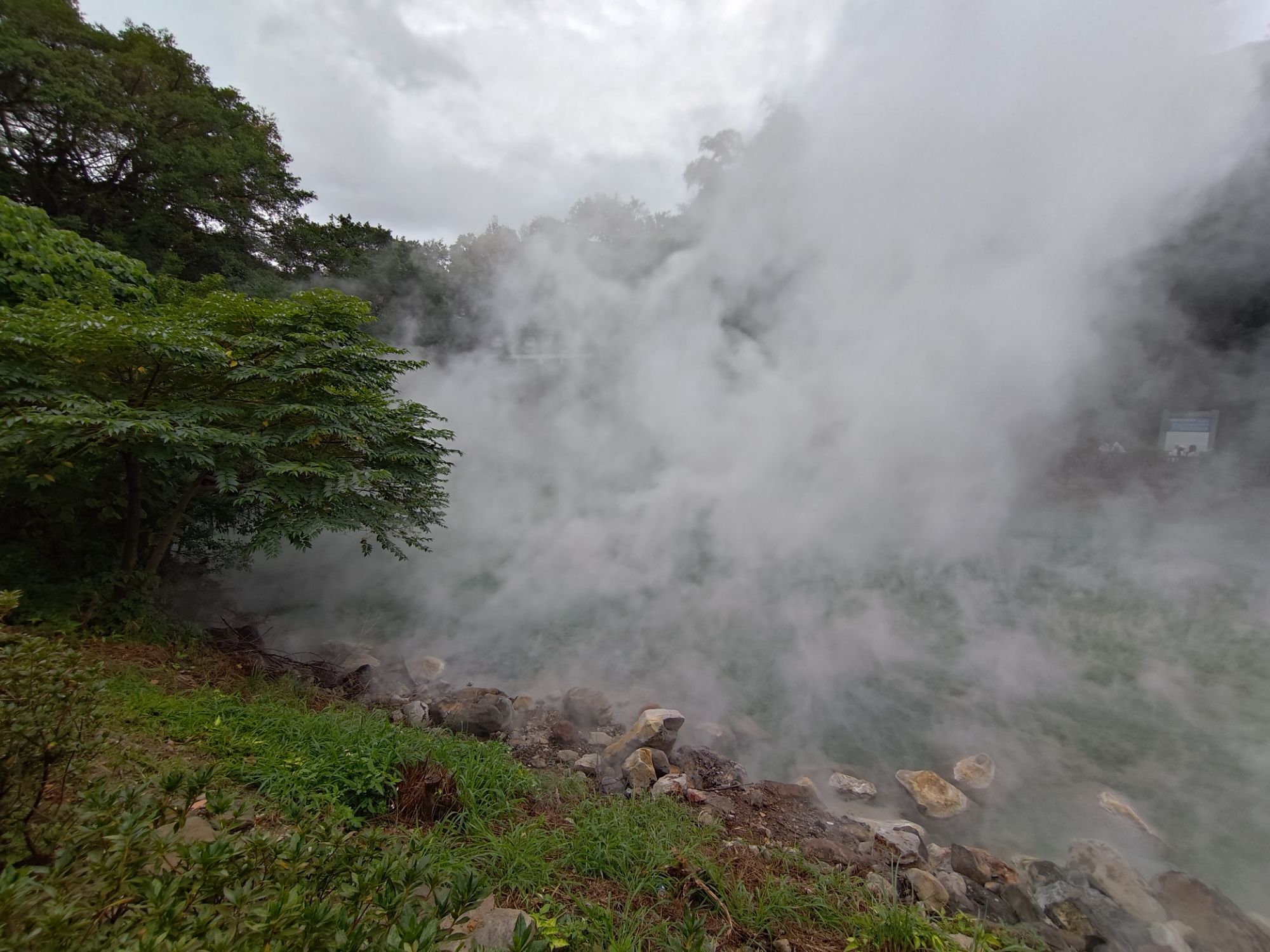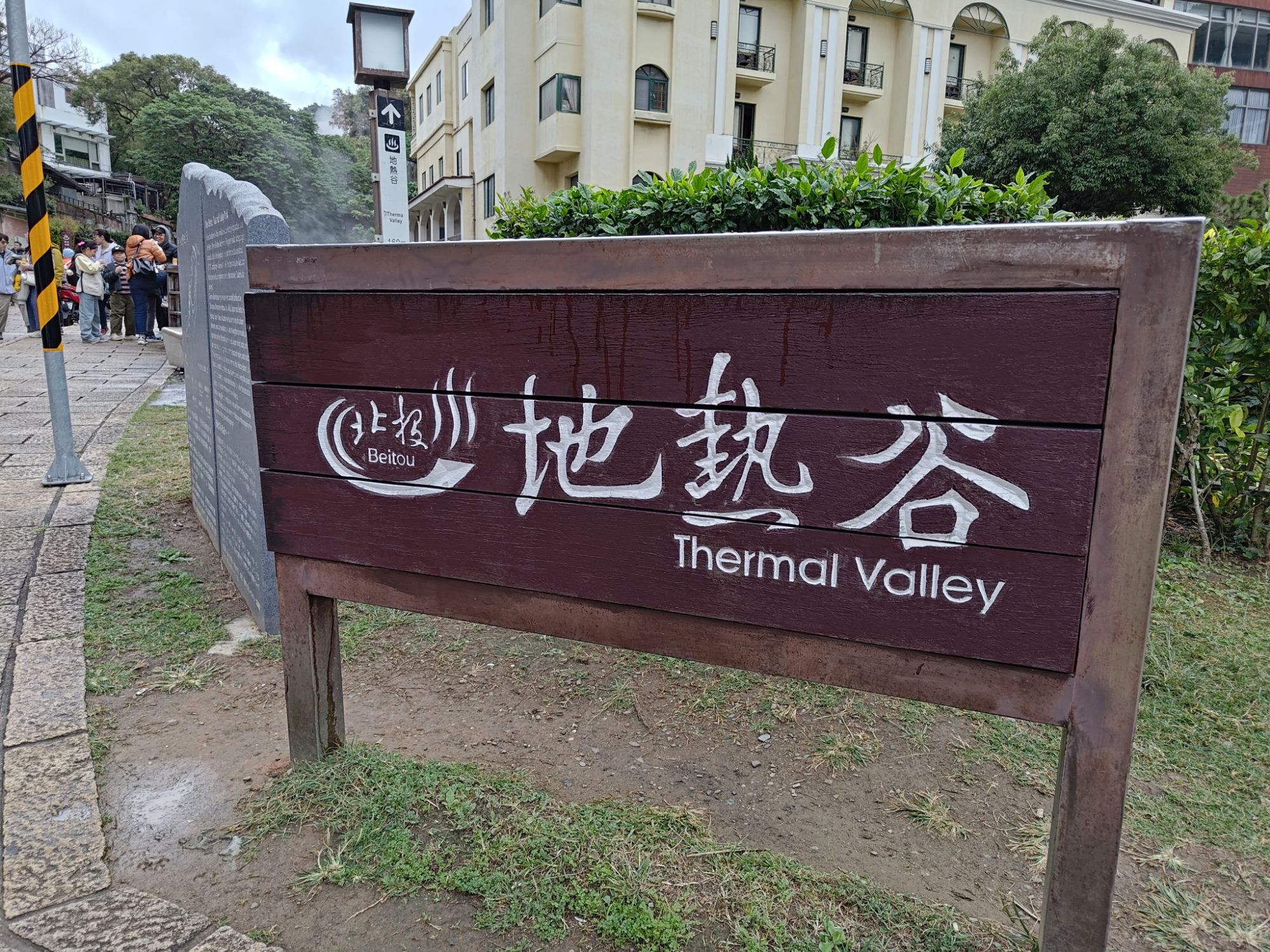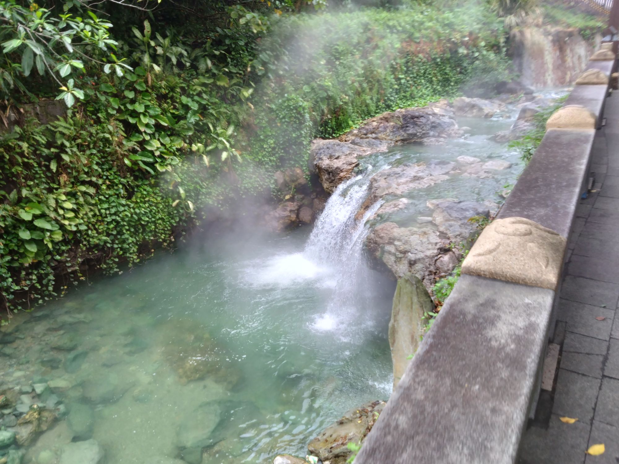 Mit dieser Wissenserweiterung und unserem Gepäck machten wir uns auf den Weg nach Beitou. Das ist eine Stadt, die nördlich an Taipeh anschließt und wo es heiße Quellen gibt. Dort hatten wir uns für die letzte Nacht in einem Hotel mit Onsen einquartiert. Nochmal richtig entspannen bevor es am nächsten Tag zum Flughafen und nach Hause ging. In einem Tal am Stadtrand gibt es einen kleinen See einer heißen Quelle. Die Quelle hat 90°C heißes Wasser und lässt die Steine grün werden.